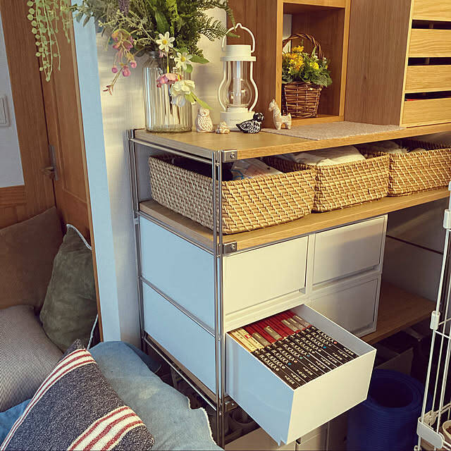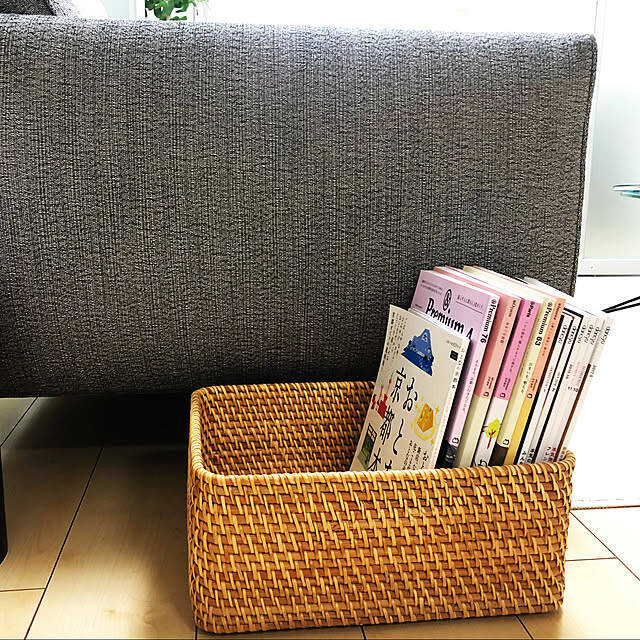 tdさんはラタンバスケットを雑誌収納にされています。コンパクトなラタンボックスは床に置いても場所を取らず、簡単に動かすこともできて使い勝手が良さそうです。自然素材のバスケットは、インテリアの邪魔をすることもありません。ソファでのリラックスタイムに、お気に入りの雑誌をすぐ手に取って楽しめますね。