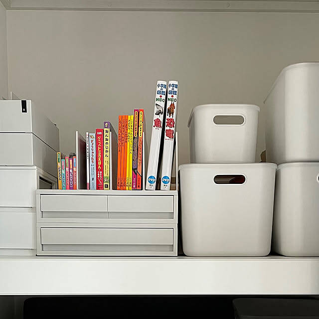 kurinokiさんはスタッキングシェルフを子ども部屋の本棚にしました。絵本や図鑑がきれいに収納されていますね。小さな絵本は、ポリプロピレンケース・引出式の上に乗せ、スペースを無駄にしない工夫も。おもちゃ収納も兼ねていて、小さなお子さんがいるご家庭にぴったりの収納スペースになっています。