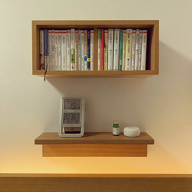 kwさんは壁に付けられる家具箱をベッドの上に設置し、文庫本を置いています。寝る前のひとときに、ベッドから手を伸ばして本を読むことができますね。壁に付けられる家具箱を使えば、ベッド周辺に本棚を置かなくてもすむので、お部屋がスッキリします。間接照明の雰囲気も良く、落ち着いた時間が過ごせそうです。