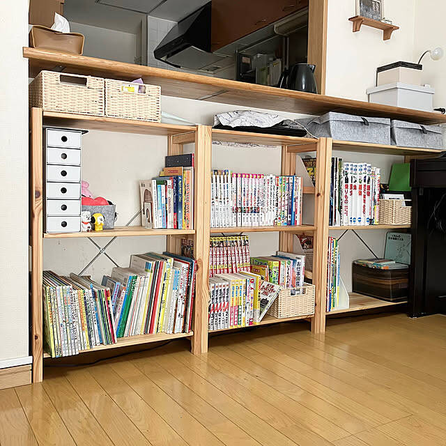 enu.さんはパイン材ユニットシェルフをリビングのカウンター下に設置し、本棚としています。お子さんの絵本や漫画などをすぐ手に取れるように置いているそうです。カウンター下のスペースにユニットシェルフがぴったりフィット。大きな収納を確保できています。これでリビングにたくさん本が置けますね。