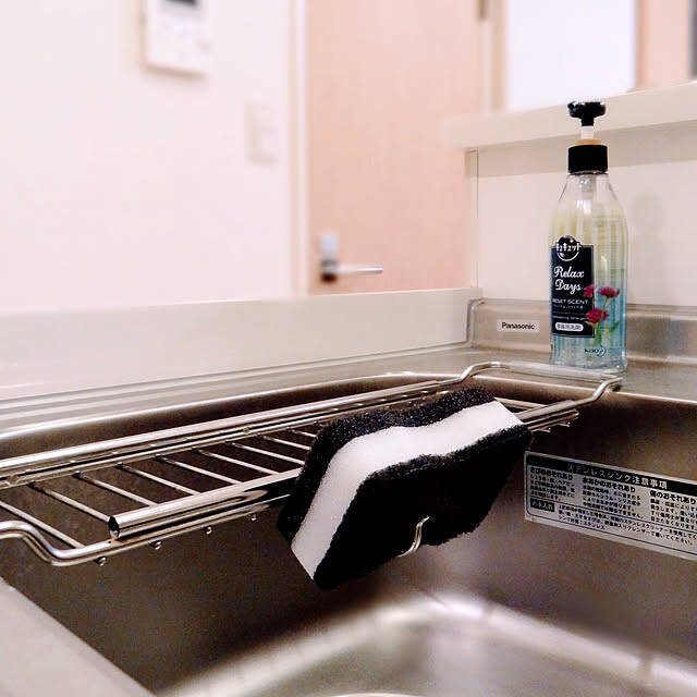 mippiさんはシンク上の水切りラックに、横ブレしにくいフックを掛けてスポンジ置き場にされていました。省スペースで見た目がスッキリして、水切れも早そうですね。サビにくいステンレス製なので、水回りの使用にもぴったりです。