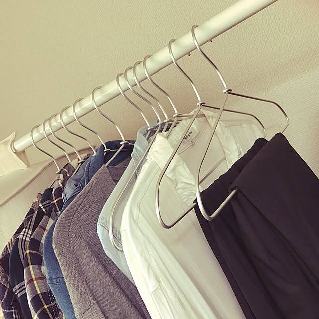 衣類と衣類の間に余裕があり、管理しやすそうなayaさんの衣類収納。必要なアイテムを厳選するのはもちろんですが、ハンガー選びも気を付けたいポイントです。ayaさんが選んだのは、無印良品のアルミハンガーです。シンプルでかさばらないので、見た目もすっきりします。幅をとらない分、空間にも余白がうまれますね。