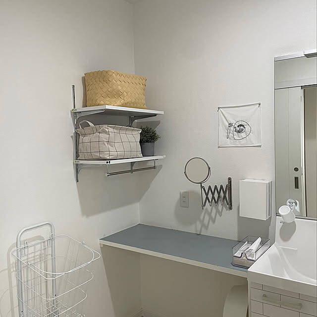 こちらの実例では、洗面台の横にウォールシェルフを設置し、カゴを載せてパジャマを収納しています。なんと洗えるカゴだそうで、清潔感があり安心ですね。ウォールシェルフを活用すればスペースも節約でき、取り出しもしやすそうです。