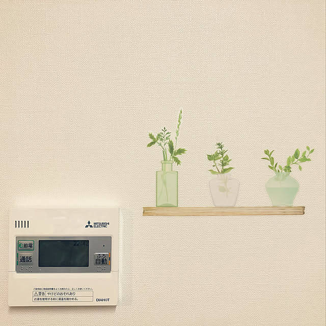 ayanyanさんは、観葉植物の代わりにウォールステッカーでお部屋を彩っています。飾り棚に3つ並んだグリーンがシンプルでかわいらしいですね。本物のグリーンを飾ると場所をとりますが、ウォールステッカーなら壁の空いたスペースを活用して貼ることができます。