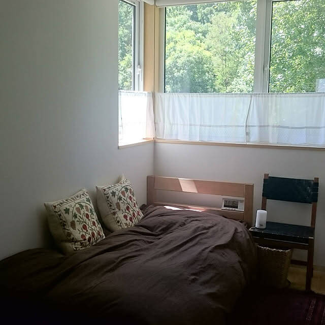 karashuさんはベッドの上で羽根クッションを使っています。クッションを置くことで、ホテルライクなベッドになっていますね。フレンチリネンの洗いざらしクッションカバーが、ナチュラルインテリアのお部屋とマッチしています。