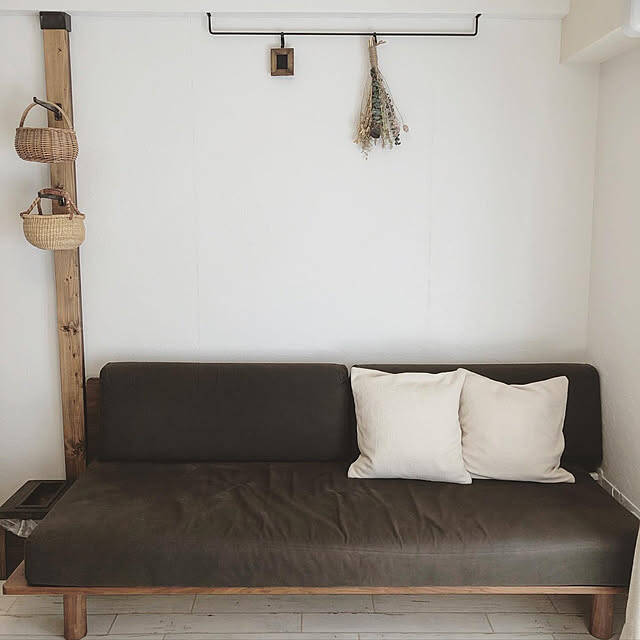 mohhaさんは季節やお部屋のインテリアに合うカバーをつけています。柔らかい羽根クッションにピッタリな優しい色のカバーですね。ソファのカラーやグリーンともマッチしており、まとまりのある空間になっています。