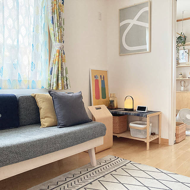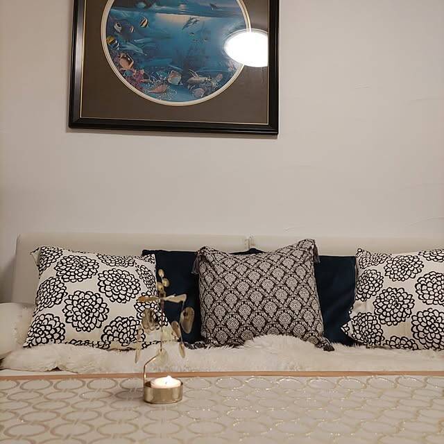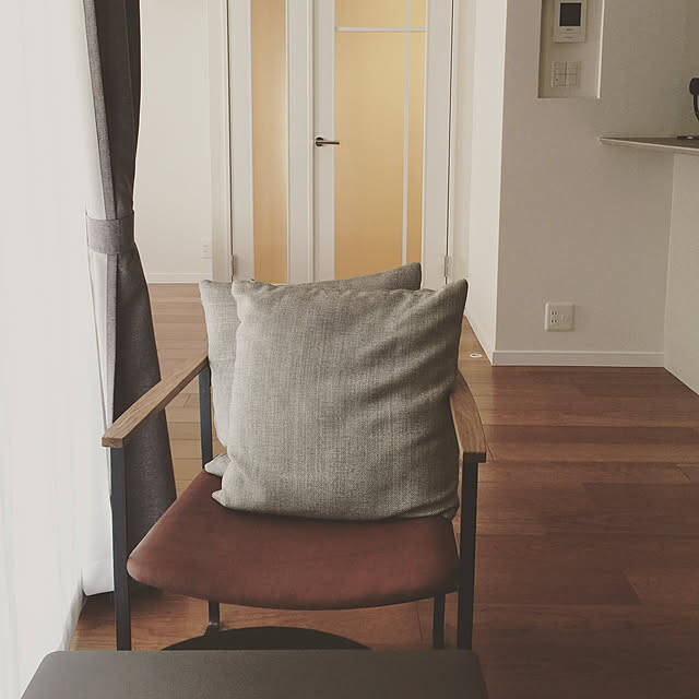 無印良品のオックスクッションカバーを使用しているSwedishさん。無印良品のものであれば、羽根クッションのサイズに合うカバーを購入できるので、ジャストフィットなものが選べます。お部屋の家具やアートなどと近い色味のカバーを選んでいて、統一感が出ていますね。