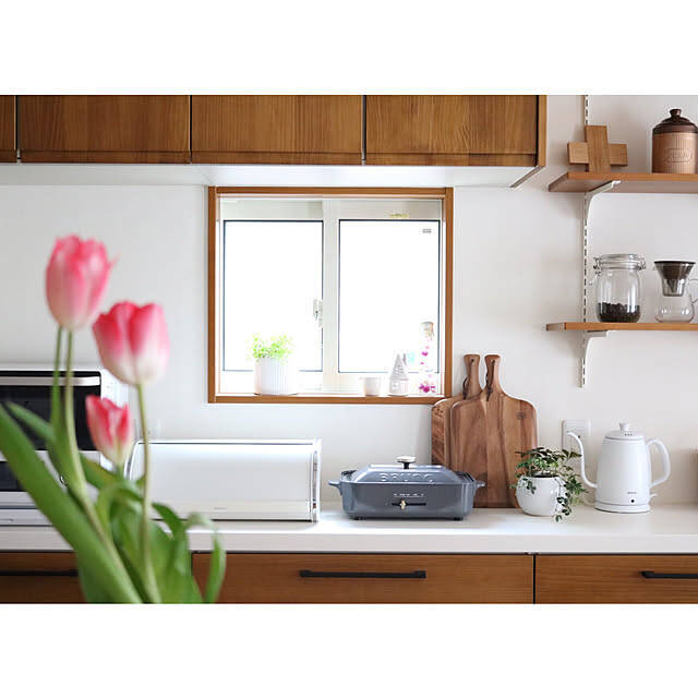 BRUNOのコンパクトホットプレートをお使いのmoimoiさんです。グレーの色味が、ホワイトとブラウンのキッチンインテリアに映えていますね。コンパクトなサイズ感で、テーブルに置いても邪魔にならず、使いやすそうです!