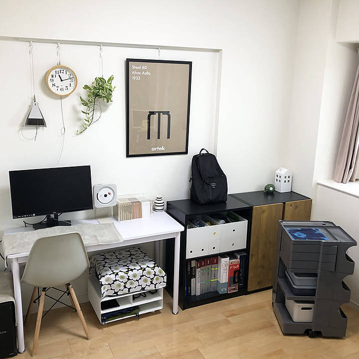 「仕事部屋のPC作業中に愛猫が遊びに来る頻度が高いため、デスク横のワゴンに空白(寄り道スポット)を残しています。一通りチェックが終わったら、ボビーワゴンの上でお昼寝するのが愛猫の毎日のルーティン(笑)ちなみに、この空白を作ったことで、物を落とすことも減りました。」