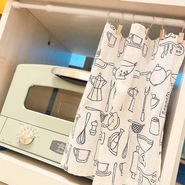 こちらの実例では、キッチンの棚のトースターを設置しているスぺ―スに突っ張り棒でミニカーテンを設置しています。家電を隠してくれるだけでなく、手描き風のデザインがカフェのような風情を演出してくれていますね。クリップの色合いも馴染みがよく、明るいキッチンになっています。