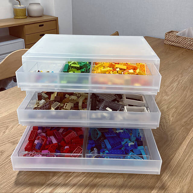 ユーザーさんはレゴブロックの収納に、「ポリプロピレンケース・引出式」の横ワイド・薄型を活用。お子さんでも片付けやすいよう、色ごとにざっくりと仕分けられたそうです。半透明のケースなので色が透けて見えます。ラベルを付けなくても、中身が分かるのも使いやすいポイントですね。