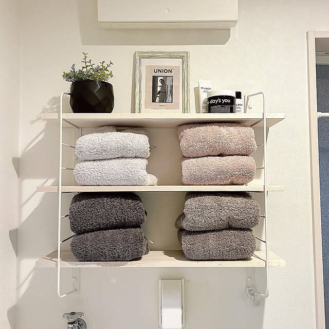 毎日使うバスタオルは、パッと手の届くところに置いておきたいもの。そんなときは、chimさんのようにウォールシェルフに収納するのがおすすめです。すっきりと見せる秘訣は、タオルのカラーにこだわること。ベージュやグレーなどのナチュラルカラーでまとめたタオルが、シンプルモダンなインテリアになじんでいます。