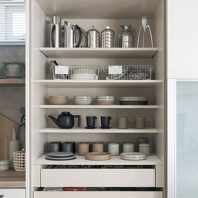 ハサミポーセリンなどの上質な食器をコレクションしているsh.atyouさん。お気に入りの食器は、こんな風にディスプレイしておくとキッチンに立つのが楽しくなります。美しく見える秘訣は、カラーや素材に統一感があること。上段はステンレス、下段はグレーやベージュなどの食器ですっきりとまとめています。