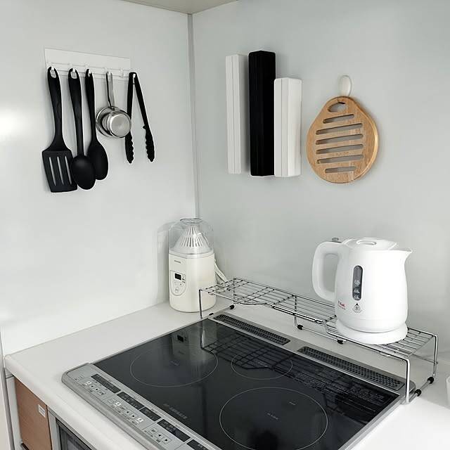 sakuraさんは、よく使うキッチンツールをコンロまわりの壁に吊り下げて収納しています。マグネットタイプのフックやラップケースを壁にペタッと貼り付けるだけなので、お手軽ですね。カラーをブラック、ホワイトで統一しているのもポイント。キッチンの美しさと使いやすさの両方を叶えるアイデアです。