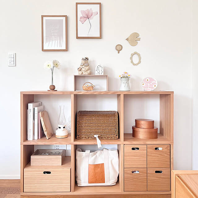 北欧ナチュラルな雰囲気満点の、sasaさんのリビング収納です。無印良品のスタッキングシェルフは、引き出しなどのオプションが充実しているので、「見せる」と「隠す」の両方を楽しめるのが魅力。シェーカーボックスやカゴの使い方も参考になります。天板にも、お気に入りの雑貨をディスプレイできますよ。