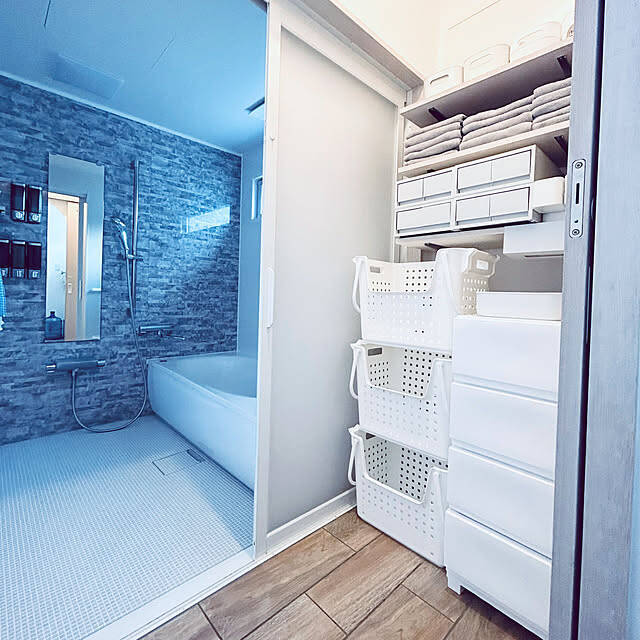 ホワイトですっきり爽やかにまとめた、Aliさん宅の脱衣所収納です。一畳という限られたスペースでも、引き出しやバスケットを上手に配置することで使いやすく美しい空間が叶いますね。こちらのカインズの洗濯カゴは、スタッキングできて省スペースで置けるところが気に入っているそうですよ。