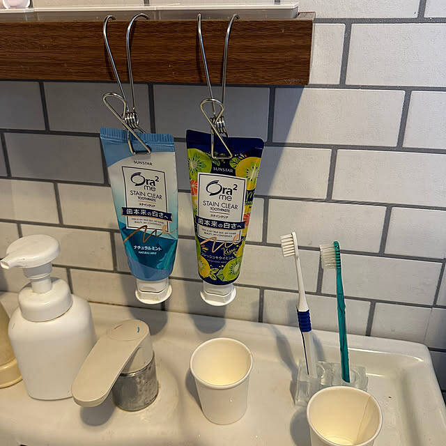 ■クリップ付きフックに歯磨き粉を挟んで