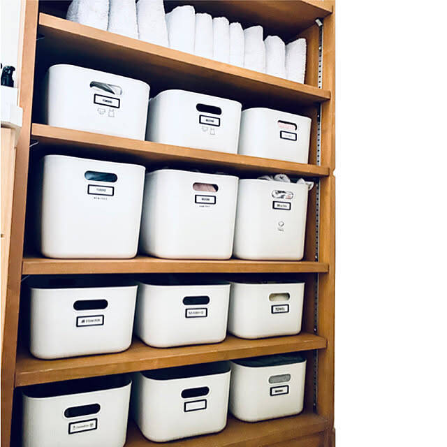 洗面所のランドリーラックの収納にやわらかポリエチレンケースを活用しているpannalさん。1番上の段のケースには、簡単に掃除が行えるように専用のフタを使っているそうです!無印良品では別売りのフタが販売されており、ケースを重ねてスタッキングすることもできますよ。