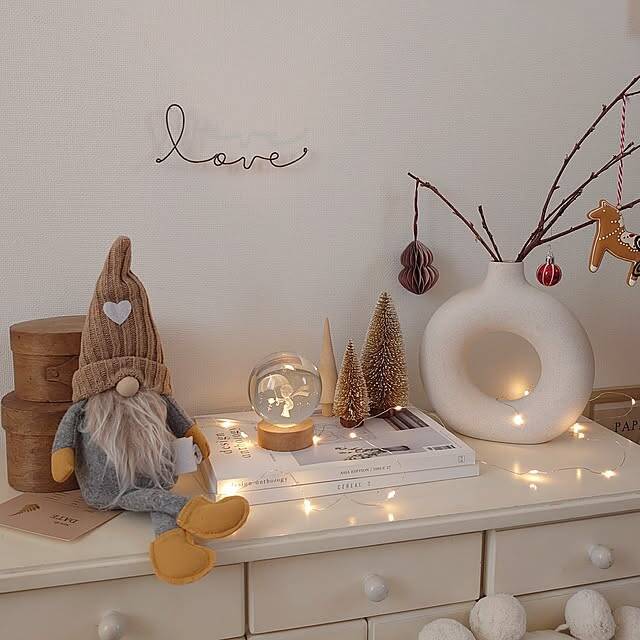 北欧テイストのコーディネートが素敵な、mri96さんのクリスマスディスプレイ。ナチュラルトーンでそろえられ、やさしい雰囲気です。そこにスノードームの美しい透明感やライトのキラキラとした灯りがプラスされることで、華やかにクリスマスムードを演出してくれていますね。