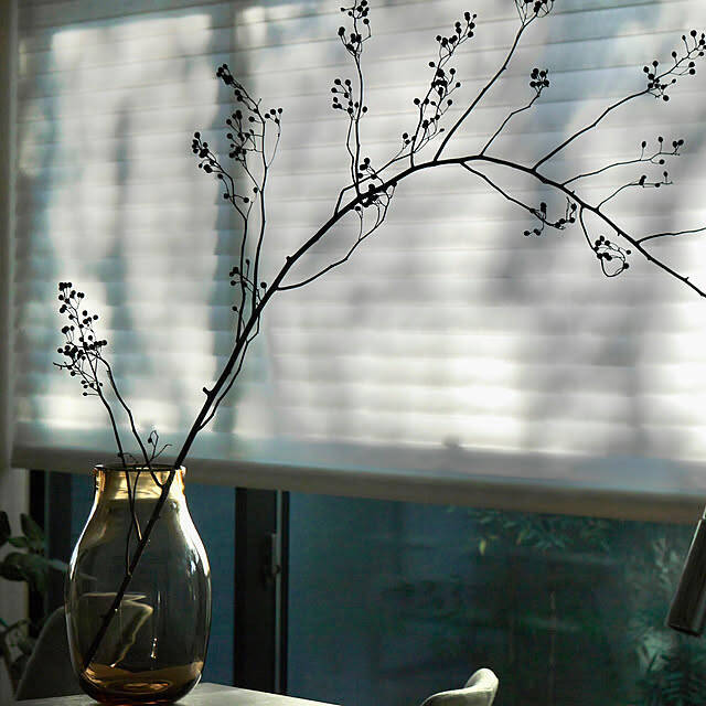 IDEEでフラワーベースを購入されたという、Norikaさん。しっかりと重さがあって、大きな枝物も問題なく飾れるとのことです。色付きのクリアなフラワーベースは、重厚感がありながらも圧迫感なく置くことができますね。