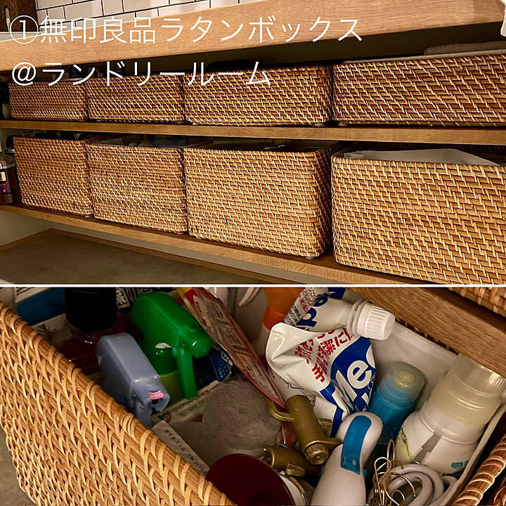 ランドリールームの造作棚には初めから無印良品のラタンボックスを配置する前提で設計士さんに考えてもらいました。引き出しよりも抜け感があって気に入っています。(中はごちゃごちゃだけどバレない!笑)」