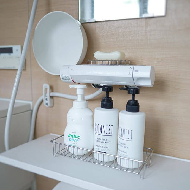 puchiさんは、無印良品のステンレスソープディッシュの上に石けんを置いています。シンプルなステンレスで清潔感があり、水切れのよさも抜群。同じ無印良品のステンレスボトルラックと合わせることで統一感が生まれ、お風呂場がすっきりまとまりますね。