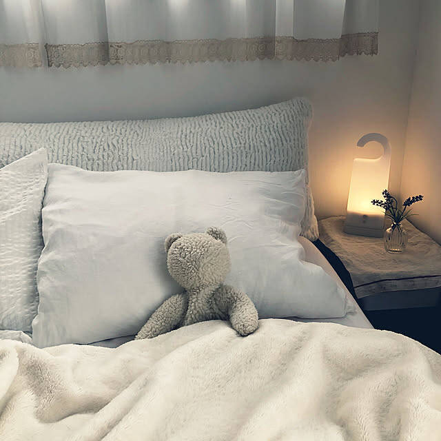 寝室の枕元に「LED持ち運びできるあかり」を置いているKaeru-Mamaさん。フワっとしたやさしい光が、ナチュラルカラーの落ち着いた寝室を照らしています。このライトは部屋に置くだけでなく、持ち運んだり、ハンガー状の持ち手を吊るしたり、ライフスタイルに合わせて自由に使えるのが魅力ですね。