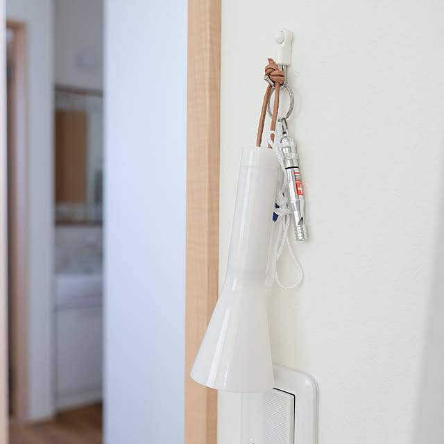 子ども部屋の入口に「LED懐中電灯」を掛けているpyokopyokopさん。非常用笛も一緒に掛け、防災対策もばっちり。ホワイトのスマートなデザインが、お部屋に自然となじみます。目の届く場所にあると、いざというとき使いやすいですね。単三乾電池1本で使用でき、防雨型なので屋外でも安心ですよ。