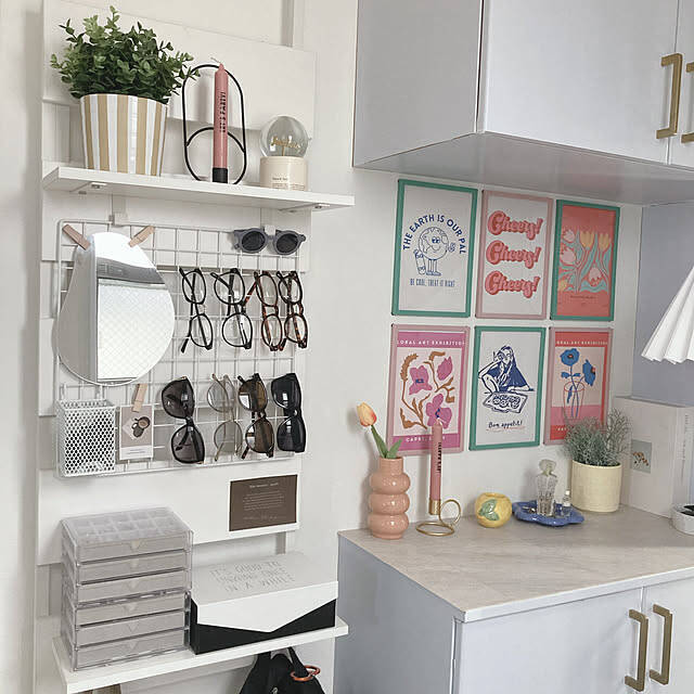 aomaさんは、玄関にワイヤーメッシュを取り付けてサングラスや眼鏡などを収納されていました。ここならお出かけ前にサッと手に取れるので、便利ですね。さらにアクセサリー類もボックスに入れて置いているとのこと。コーディネートの仕上げが1か所でできる、ナイスアイデアです。
