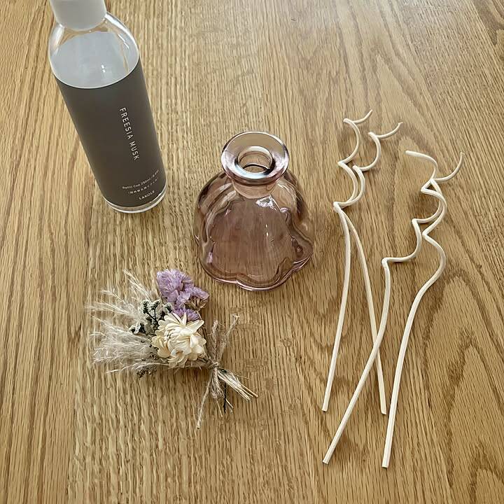 フレグランスオイルを注ぐ際、液ダレしやすいのでご注意ください。花瓶は口が細い方が、中のオイルが蒸発しにくくおすすめです。ドライフラワーは、パッケージから出した直後は花が潰れているので、丁寧に形を整えてあげると見映えが良くなります。執筆:RoomClip mag 編集部