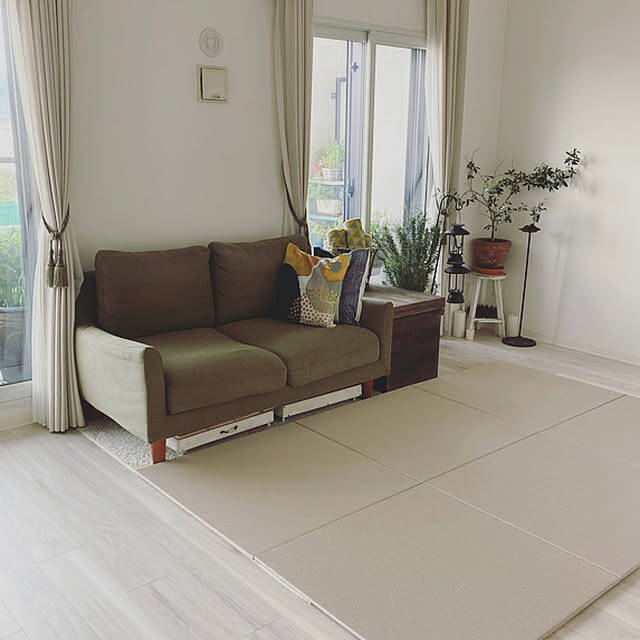 畳の上でお子さんが遊ぶ姿が微笑ましいnamiさんのリビング。70cm×70cmの置き畳6枚でお子さんが遊ぶのにちょうど良い広さだそう。滑り止め付きなので、走ったり飛び跳ねたりしても隙間が少し開く程度で安心です。い草の香りやさらりとした肌触りも心地よく、お子さんがのびのびと遊べる空間になっていますね。
