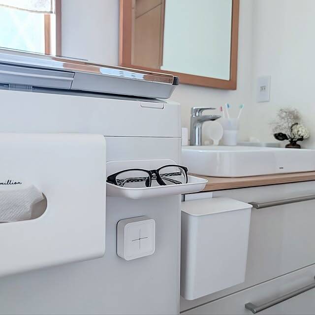 洗面台周りを浮かせる収納にしているという、mak.さんです。セリアのマグネット式小物トレイを洗濯機にくっつけて、メガネの置き場所として使っています。水がかからない位置なので、ヘアゴムや腕時計などのちょこっと置きにも便利だそうですよ。