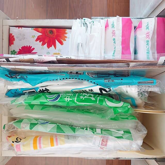 merirynさんは、キッチンの縦長の引き出しにゴミ袋を収納されています。使い捨ての袋類や排水口ネット、サイズも用途もさまざまなゴミ袋が並んでいます。ブックエンドを置いて、細かく仕切れるように工夫されました。袋が自立して使いやすそうですね!