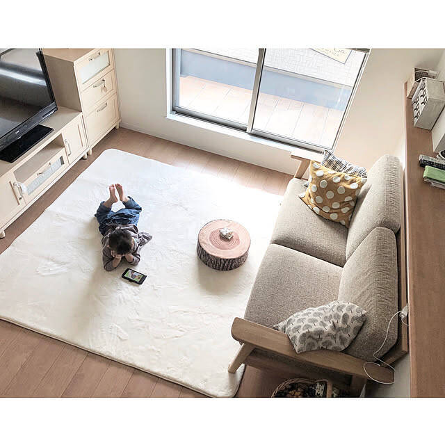 makochi.mさんが冬になると愛用しているのは、しまむらのファイバーヒートラグです。ふわふわで気持ちのよいラグにお子さんも大喜びとのこと。シンプルな白のラグで、北欧を感じるインテリアにも良く似合っていますね。