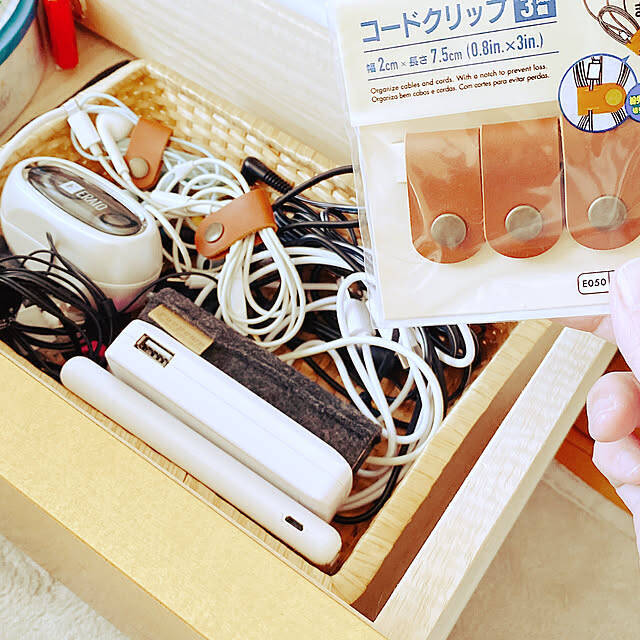 普段あまり使わないコード類を、家族分まとめて引き出しに収納しているmoolさん。絡まりやすいイヤホンのコードにはダイソーのコードクリップを活用されているそうです。レザー調の落ち着いたデザインが、無機質なコードのなかでも目に留まりますね。使い勝手も良いそうですよ。
