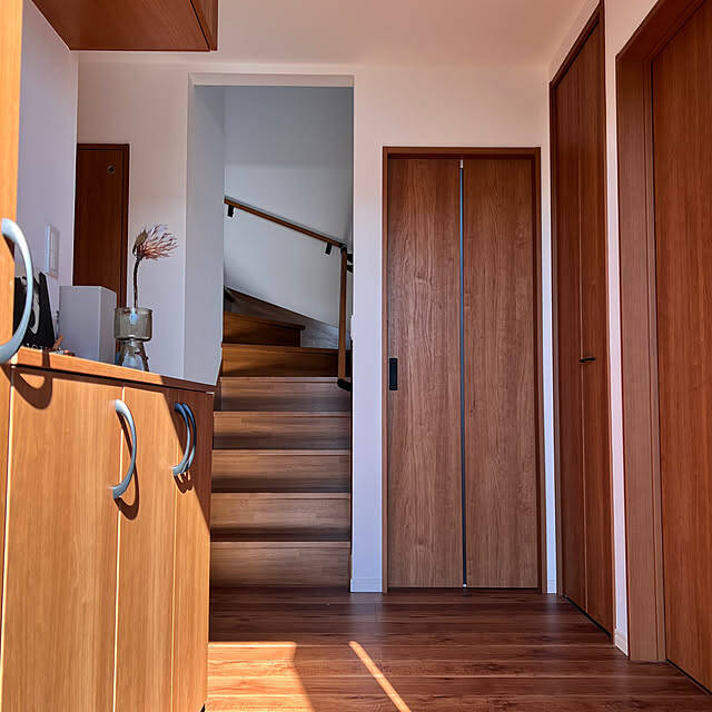 pokowheeさん宅の玄関に入るとすぐ、木のぬくもりと落ち着いた風合いに心が安らぎます。建具の表情や陰影を楽しめる、シンプルなスタイリングもとても素敵です。
