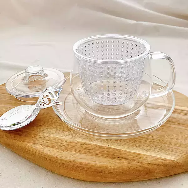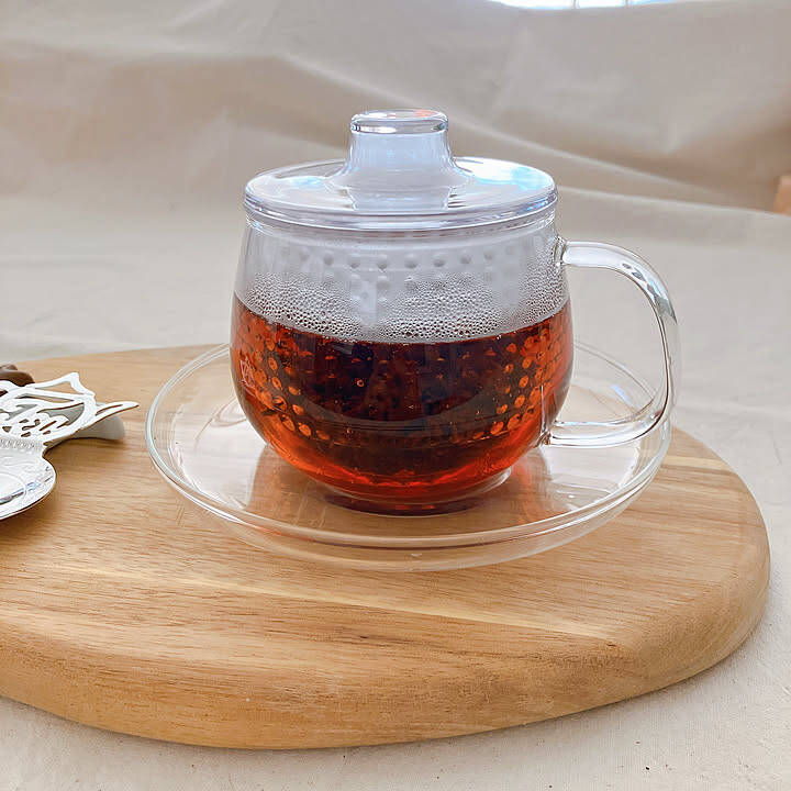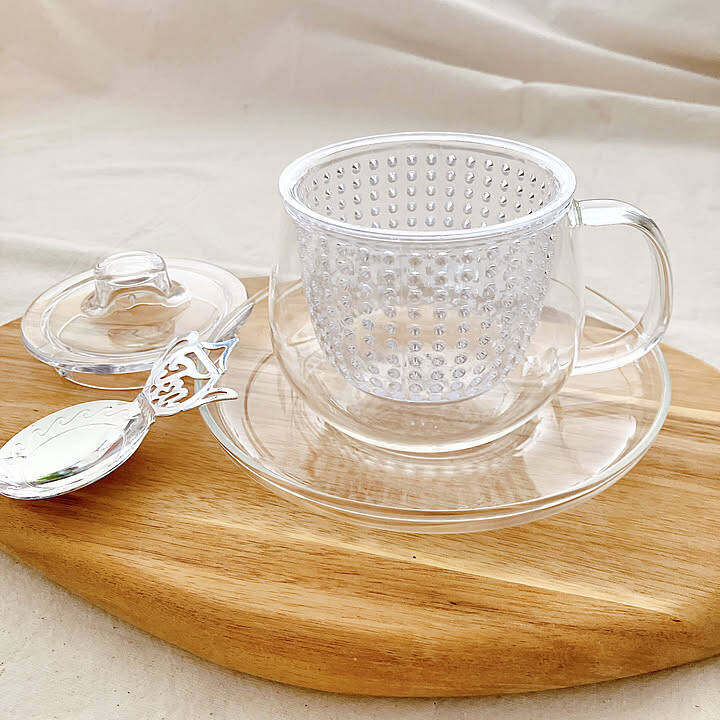 mako2yaaさん「こちらは、ストレーナー(茶こし)と蓋が付いた1人用ガラスマグです。」