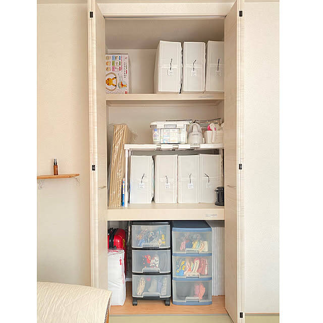 押入れの収納を見直して、SKUBBの44×55×19cmのサイズを7個買い足したnamiさん。ケースの中には寝具やお子さんのシーズンオフの衣服を収納しているそうです。同じ形のケースにそろえることで、見た目がすっきりとしており、出し入れの行いやすそうな収納になっていますね♪
