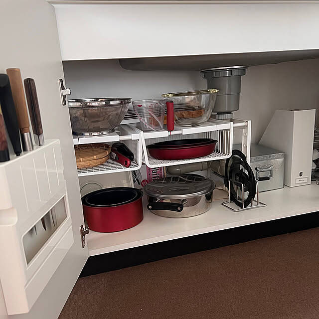 キッチンのシンク下で、ニトリの「シンク下伸縮ラック」をお使いのユーザーさんです。伸縮ラックは、配管を避けて置けるので、シンク下に便利ですよね。ユーザーさんは、さらにディッシュラックを組み合わせる技を使って、フライパン収納を作り出していましたよ。これで、空間をより無駄なく使えます。