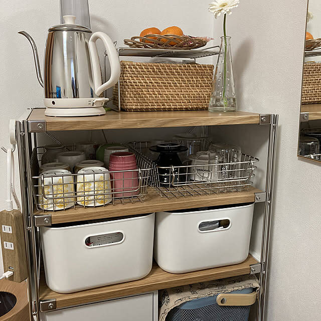 ユーザーさんが使用されているのは、高さのない場所にも置きやすい、浅型のステンレスワイヤーバスケットです。ユニットシェルフの1段目に2つ並べて、マグカップやコーヒーグッズを収納されています。よく使う物をひとまとめにでき、使うときもトレーのようにサッと引き出せて便利ですね。