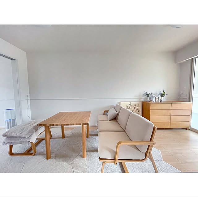 ベージュ系の淡い色味でまとめた、room...ronさんのお部屋です。こちらの無印良品のダイニングテーブルは、天板と脚が別売りになっている商品。シーンに合わせて、脚の長さを変えられるのが魅力です。ダイニングチェアやベンチも無印良品でそろえて、シンプルで居心地の良い空間に仕上がっていますね。