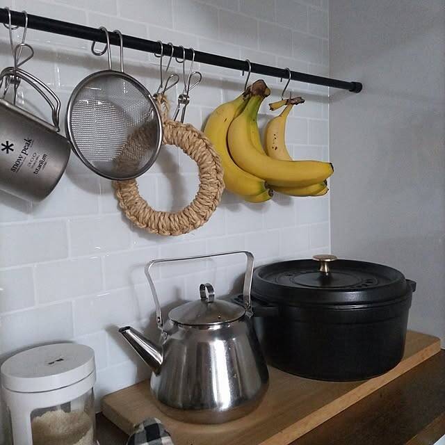 sakiさんは、バナナをS字フックで吊るして保管しています。バナナスタンドと違って置くための場所を確保する必要がなく、省スペースに収納できるアイデアです。吊るしていると風通しもいいので、衛生的に保っておけるのも安心ですね。