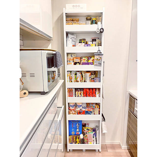 ディノスさんのすきまワゴン♪たった16センチの奥行きでこんなに収納してくれます‼︎ 在庫の過不足が一目瞭然なので買い過ぎ、買い忘れも無くなりました。本当にオススメです♡