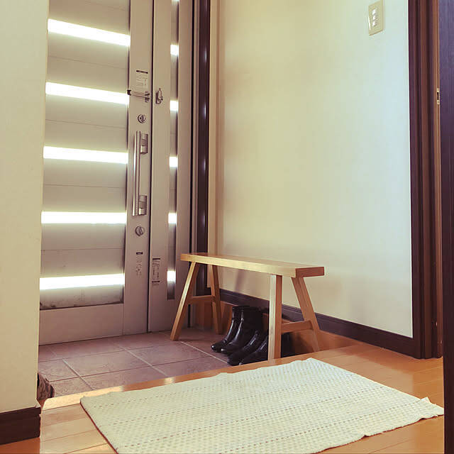 玄関に無印良品のベンチを置くと、靴を履くときに腰掛けたり、カバンや荷物をちょっと置いたりと便利に使えます。スリムなので、玄関の限られたスペースに置きやすいのもポイント。sachanさんのように、下に靴を置けばスペースをムダなく使えますね。