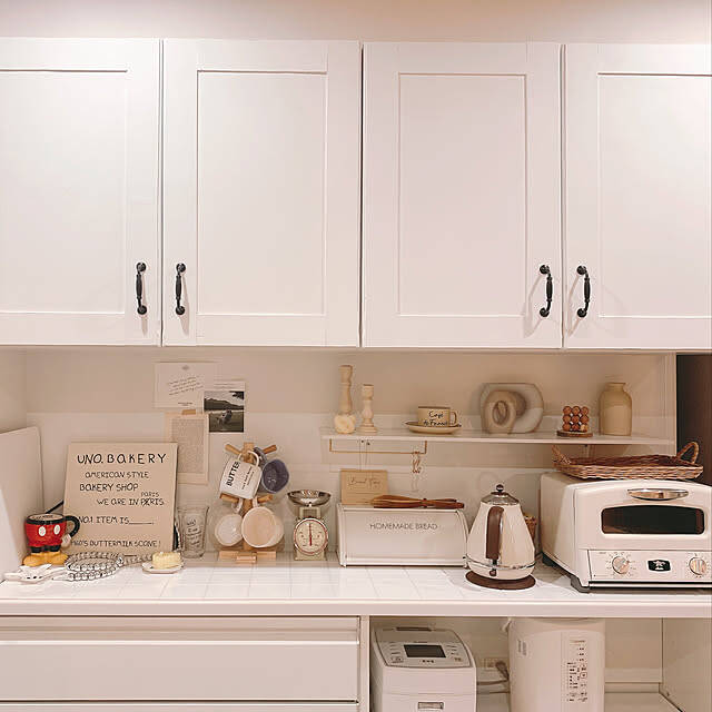 こちらの実例では、キッチン背面の白い収納棚にモールディング装飾をプラスしています。クラシカルなデザインの取っ手も合わせ、明るく優雅な印象のキッチンが完成していますね。シンプルな四角いデザインが、ナチュラルな棚のディスプレイを引き立てています。