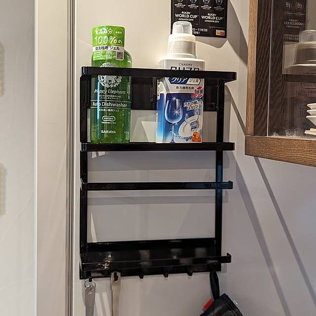 こちらは、towerの「マグネット冷蔵庫サイドラック」です。ラックと引っ掛け収納が一体になったデザインは、収納力も抜群♪Kaoriさんによると、冷蔵庫脇にある食洗機の洗剤もここに収納することで、すぐ手に取ることができて便利だそうですよ。