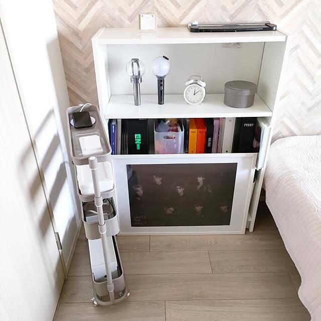 壁のコンセントとわずかな隙間を活用して充電ステーションを作られていた、tttbbbさんの実例です。隙間にもおけるトローリーを設置したことで、スマホやタブレットを充電しながら収納できる場所が確保されています。