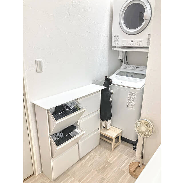 ユーザーさんの洗面脱衣室に取り付けられた収納棚。ご家族がランドリーラックの代わりに、DIYされたものだそうです。棚の上にはフラップ式のケースを置き、タオル類やルームウェアを目隠ししながら収納。フタが大きく開くので中が見やすく、高い場所の出し入れもしやすそうですね。