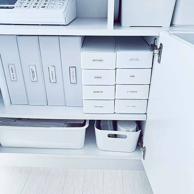 kiraさんは、文具や工具、裁縫道具など、日ごろよく使うアイテムを粘土ケースに収納していました。フタに溝が付いているので、重ねて収納してもずれにくく、ストレスなく使えますよ。たくさん重ねられるので、キャビネット内の収納スペースも無駄なく活用できています。