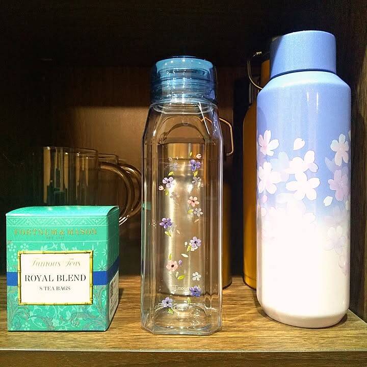 rikkyさん「花柄に一目惚れして実店舗購入。アフタヌーンティーリビング、エリタージュフルールシリーズのオクタゴンボトル400mL(中央)は、ランチ用に購入。お仕事で使わない時は部屋のマグがわりに愛用です♡使わない時はスタバ桜シリーズのボトルと並べて。飾っておくだけでも可愛い♪」